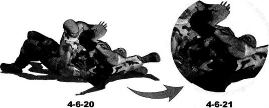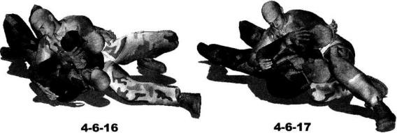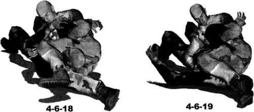 我胸襟纠缠不休时我左臂屈肘左手自对方左臂上方穿插至其双臂之间(图4-6-13)。动作不停左手向右穿插至对方右臂下方然后屈肘揽住其右臂迫使其右臂弯曲并迅速俯身向下压制(图4-6-14)。随即上体向左侧摆动右臂随身体的摆动伸展至对方身体左侧然后屈肘以小臂扶撑地面(图4-6-15)。动作不停身体猛然向左侧翻转以腰胯的转动带动左脚向身体左后方摆动右腿随势向右前方摆动伸展以右侧臀部着地。右手搂住对方左侧腰肋部左臂屈肘随身体的翻转夹持着对方右臂向左后方摆动针对其右臂肩、肘关节实施扭曲和别锁(图4-6-16)。继而右手揽住对方左臂大臂部位将其上身向上提拉右腿屈膝顺势将大腿插到其右侧肩颈下方右脚向后回收左脚向前摆动(图4-6-17)。动作不停左腿抬起内扣以左腿膝窝勾挂住对方脖颈部位(图4-6-18)进一步可以用左脚脚踝勾挂住自己右脚脚踝针对其颈部实施绞索此时上体再向左后方转摆时会给对方的手臂造成更加巨大的创伤(图4-6-19-图4-6-21)