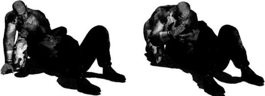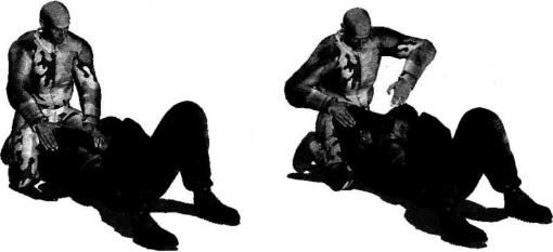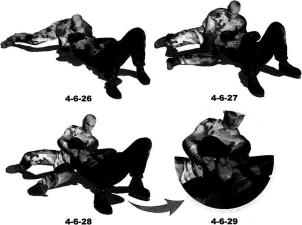 双方展开地面缠斗时对方被动仰躺于地面我跪坐于对手头部上方对方双臂弯曲交叉收抱于胸前防守严密使我一时无从下手发动攻击(图4-6-22)我首先用右手抓住对方右臂肘尖部位并用力向后拉扯导致其双臂防守产生松懈同时左臂屈肘抬起(图4-6-23)。然后左手自左向右快速由对方右臂下方的空隙间插入并屈肘夹紧其右小臂(图4-6-24)。右臂屈肘抱住对方右臂肘关节下方(图4-6-25)。随即双脚向后伸展蹬地以提高自身的稳定性(图4-6-26)。紧接着身体猛然向右侧翻转以腰胯的转动带动右脚向身体右后方摆动左腿随势向左前方摆动伸展以左侧臀部着地右臂屈肘随身体的翻转夹持着对方右臂针对其右肘关节实施扭曲和别锁(图4-6-27-图4-6-29)。