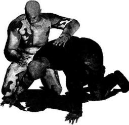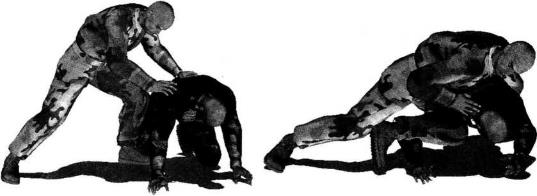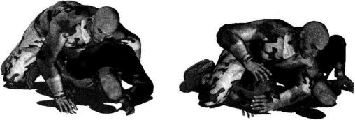 地面缠斗中对手俯身跪地呈犬式防守姿态双臂伸展双手撑扶地面我跪于对手身体右侧寻找进攻机会(图4-6-68)。趁其不备我伸展左臂由后背搂抱住对方左侧躯干右手顺势抄抓其右手手腕(图4-6-69)。继而身体重心上提右