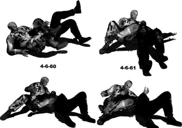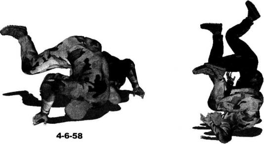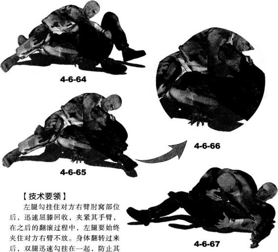 同时左腿屈膝左脚向前伸入对手胸腹下方向右、向后勾住对方右侧手臂与肘窝部位(图4-6-55)。继而身体重心下沉上体用力向下压制对方后背左腿屈膝勾紧别折对方右臂肘令对方趴伏于地面(图4-6-56)。紧接着身体向右侧摆动右腿屈膝右脚随势向右后方摆动左臂放松对敌人躯干的控制伸展至对方头部一侧左侧肩臂向后抵住对方脖颈(图4-6-57)。动作不停身体弯曲身体向前翻滚(图4-6-58)翻滚过程中左腿要用力弯曲勾挂对方右臂迫使对方随我的翻滚一并滚动(图4-6-59)。当我的身体翻滚至后背着地时也将对方掀翻过来令其仰面朝天(图4-6-60、图4-6-61)随即上体略微前探左腿屈膝勾锁住对方右臂的同时抬起右腿屈膝以膝窝部位勾挂住自己左脚脚踝部位从而用双腿针对其右臂形成锁别之势(图4-6-62、图4-6-63)。进一步身体向左翻转上体前探右臂伸展以右手去揽抓对方左腿(图4-6-64)。右臂屈肘搂住对方左大腿同时用左臂控制住其身体躯干左侧这样可以加大针对其右臂锁别的力度令其产生难忍剧痛(图4-6-65-图4-6-67)。