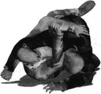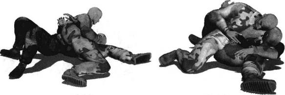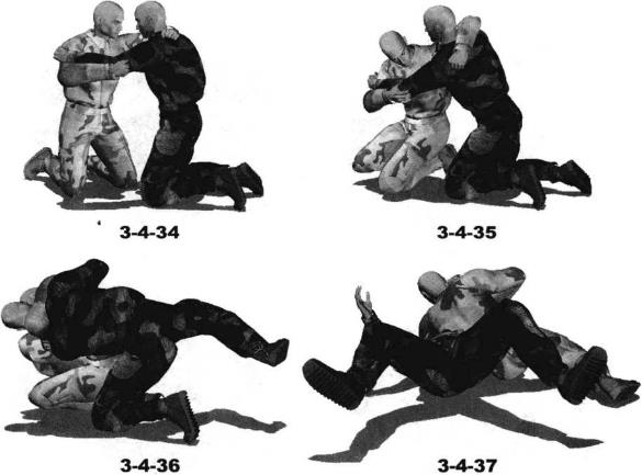 1、双方在地面展开跪撑搏斗彼此屈膝跪地撕扯在一起对手用左手抓住我右侧肩头我用右手揽抓住其左臂左臂屈肘揽住对手脖颈左手抓住其后肩(图3-4-34)发动攻击时身体猛然向右转动臀部向后抵顶对方腰腹部右手用力向右拉