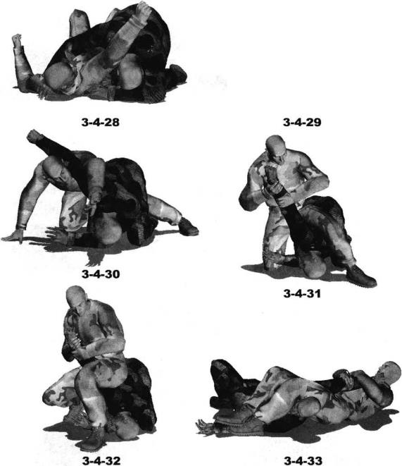28)。动作不停身体继续向右翻转左手搂抱住对方肩背左脚抬起紧贴对方臀部(图3-4-29)继而在身体继续向右翻转的同时左臂用力向下压制对方右肩部身体翻转至面部朝下时用右手着地右腿屈膝跪地支撑身体(图3-4-30)随即身体重心上提左腿先由对方身体上方绕过然后向对方身体左侧落步臀部后坐从而形成针对对方腰肋部位的骑乘同时用双手揽住对方右臂(图3-4-31)进一步可以将左脚移动至对方头部右侧身体向右转动双手翻拧对方右臂针对其肩关节实施别锁(图3-4-32)随即身体向后仰躺可以针对对方右臂实施十字臂锁(图3-4-33)。