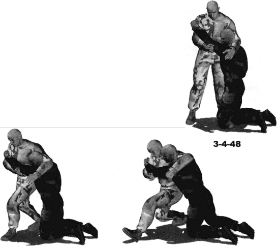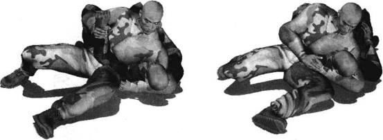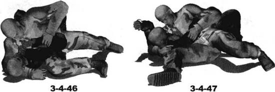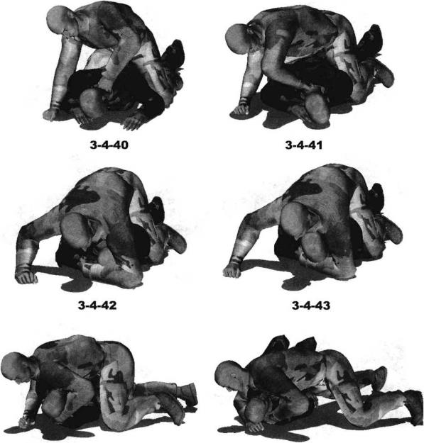 3、我骑乘于其后背双腿屈膝夹紧其两肋左手揪扯对手后脖领右手扶撑地面(图3-4-40)发动攻击时身体重心猛然向右前方移动(图3-4-41)上体迅速前俯胸部抵压住对手背部左手攥住对方后脖领不放左臂屈肘由对方头顶绕过圈套住其脖颈(图3-4-42、图3-4-43)。随即左手用力左后方拉扯对手后脖领双脚向后蹬地以右肩与胸部为力点推动对方上体迫使其由趴伏状态翻转为仰躺之势(图3-4-44图3-4-45)。对手后背着地