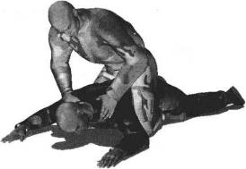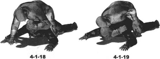 地面缠斗中对手面朝下趴伏于地面我骑乘于对手后背之上双腿夹紧对方躯干双手按压其双肩令其处于被动局面(图4-1-17)展开攻击时我先向前俯身用右手扶撑对手头部右前方地面并用左手自下而上搬拉对方额头迫使其向上抬起头来令其颈部下方露出空隙(图4-1-18)随即右臂屈肘右手自右向左由