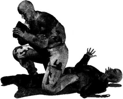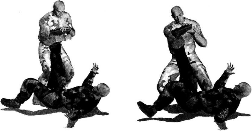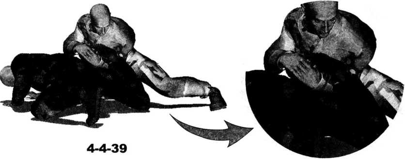 双方交手对方俯身跪地呈龟式防守姿势我位于其身体右侧上体压制其后背(图4-4-35)发动攻击时我迅速向左拧转身体伸出左手抓住对方右脚脚踝并用力向上提拉令其离开地面(图4-4-36)身体继续向左转动右腿屈膝跪地重心下沉右胸肋部位牢牢贴紧对方右侧腰胯位置右臂随身体转动伸至对方右脚上方扣抓住对方右脚脚掌部位虎口朝内(图4-4-37)。随即右手用力向上、向怀中提拉对方右脚左臂同时屈肘、内旋用左手扣按住对方右脚脚背、脚趾部位(图4-4-38)。继而双手一并用力向右、向怀中搬拉对方右脚脚背左肘外展别住对手右脚脚踝形成锁控之势瞬间可迫使对方趴俯于地面(图4-4-39、图4-4-40)