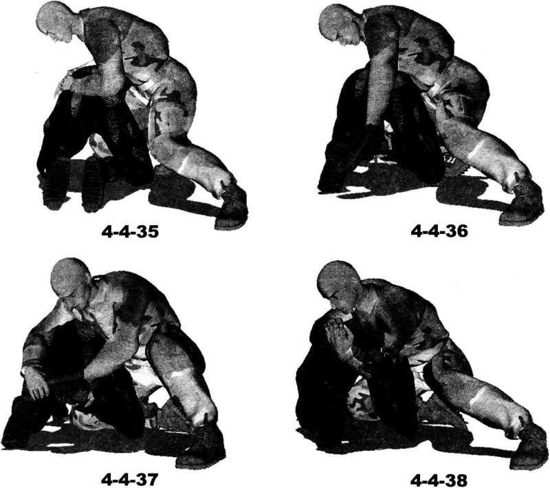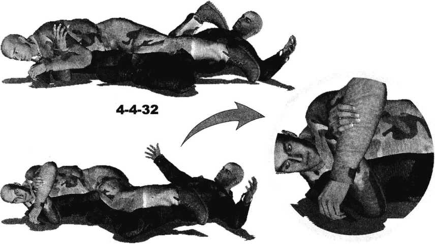 双腿屈膝夹住其右腿膝关节部位左手抓住对方右脚外沿、脚趾部位(图4-4-28)。紧接着身体右转左脚随身体转动抬脚跨过对方身体落步于对方身体左侧双腿屈膝下蹲同时右手抓拉自己左臂双手随身体转动牢牢控制住对手右脚(图4-4-29、图4-4-30)。然后身体重心下沉左腿继续屈膝以膝盖着地(图4-4-31)。动作不停身体前俯双臂将对方右腿揽在怀中随身体前倾一并倒地躯干压在对方右腿之上(图4-4-32)。随即身体向左翻转右臂屈肘锁揽对方右脚脚踝左手用力向前、向下按压其右脚外沿、脚趾部位双臂交错发力针对其右脚实施脚趾固锁(图4-4-33,图4-4-34)。