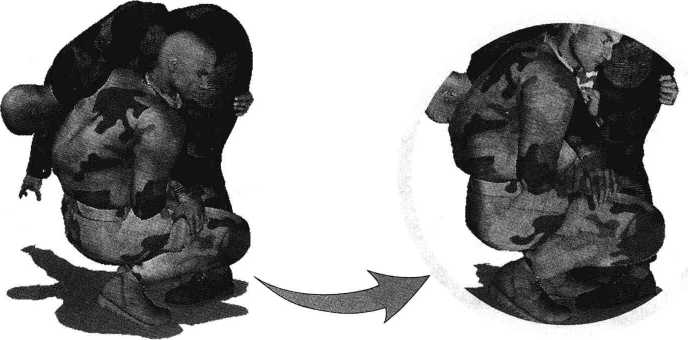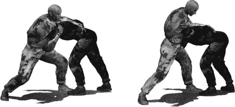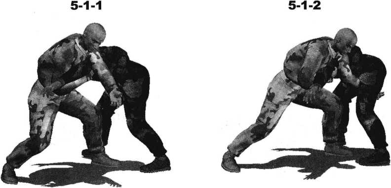 双方交手纠缠一起我抢先用右手揽抓住对手左臂肘将其揽至怀中左手自对手左肩头上方穿过向下抓住对手后背衣衫或后腰带(图5-1-1)左臂屈肘以肘尖和小臂向下后方按压对手后肩与后颈部迫使其低头俯身以便我进一步发动攻击(图5-1-2)。在对方身体前俯瞬间我左手松开对敌人后背的抓握直臂向内侧下方伸展以左臂大臂为力点向下挤压对手左侧肩胛关节部位(图5-1-3)。动作不停身体重心猛然下沉左手自对方左臂一侧向其裆部穿插沿其大腿内侧揽抓住对方左大腿根部(图5-1-4)随即左脚向前踏入对方中门、两脚之间右脚紧跟着向对方左脚外侧上步双腿屈膝重心下沉左臂牢牢搂抱住对手左侧大腿根部右手牵制其左臂(图5-1-5、图5-1-6)。继而臀部向后下方下落、着地上体向后仰躺呈后滚翻之势双臂协同动作双脚随身体后滚翻而蹬地向上、向后荡起借助身体