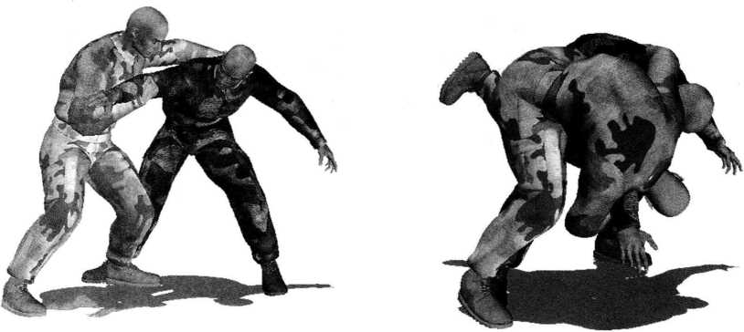 我抢先抓住对方手臂和肩背抢占优势把位后即可立即展开投摔(图5-1-26)。我猛然身体前俯重心前移左脚向后抬起屈膝向后上方勾撩以小腿接近膝窝部位为力点勾挂对手裆部和臀部双臂配合下拉(图