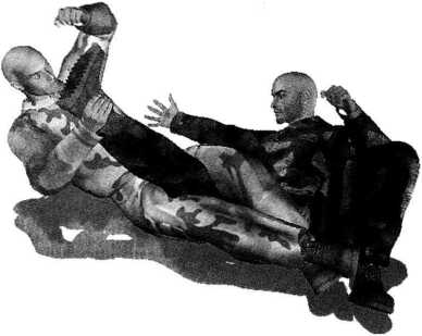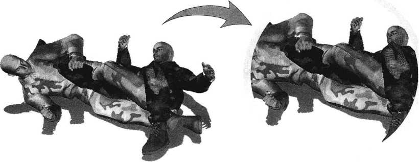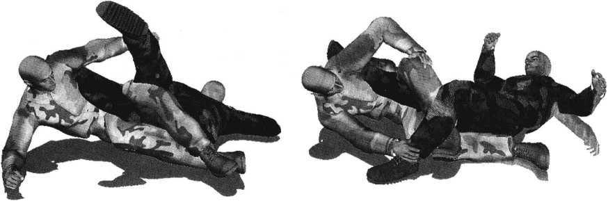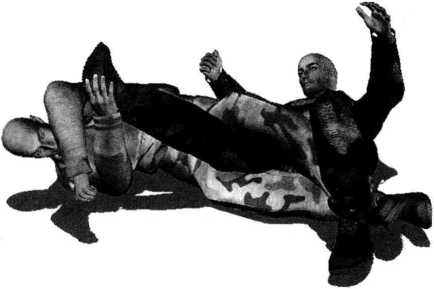 5- 1-27)。周身协调动作通过自身的前滚翻破坏对手身体重心的平稳瞬间可以将对方掀翻在地。在对方臀部着地的霎那右手顺势搂抓住对方右脚脚踝部位将其右腿控制于我两腿间(图5-1-28)。继而身体向右侧转动右侧腰胯与臀部着地左臂随之抬起展开腋窝同时右手用力向左侧推撑对方右脚将其推至我左侧腋下(图5-1-29)。随即左臂屈肘夹紧以左大臂后侧及肩胛骨后部为力点抵住对手