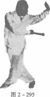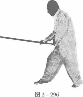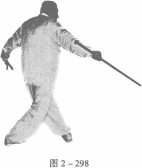 成外横足,左足向前进一步,落成顺足,使两足变成左式三体步; 同时,右手持鞭把向后抽回,停于右胯后侧,左手按于腹前成阴 掌,目视前方(图2-297)。