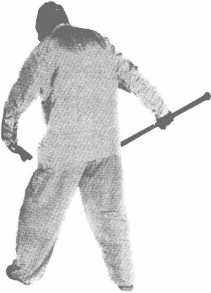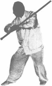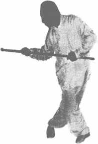 此为打法,是上动的继续。设敌器械已被我用上动顾住,此 时则用倒插步和鞭梢猛力甩打敌人的腰腹部。