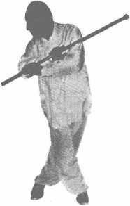 此动为打法,也是上动的继续。设敌器械已被我用上动拨 开,此时我急以右手甩出鞭把,猛打敌人足部的踝骨,使其失去 抵御能力。