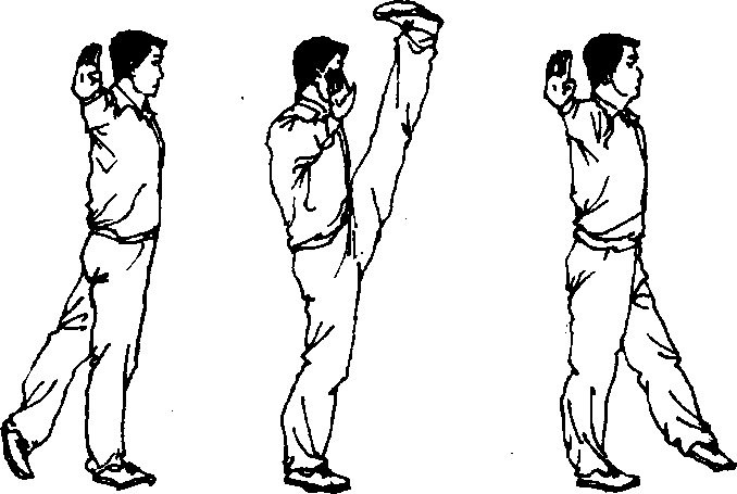 (1)正踢腿:①身体直立,正向前方,两手平撑于 体侧,右脚向前垫步,左腿脚尖勾起,迅速向前额直摆 上踢。摆踢后,脚轻落于身前,脚尖点地(图60、61、 62) o