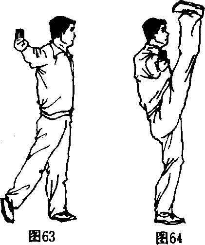 ②左脚稍向前垫步,右腿向上直摆,右脚尖向前 额摆踢(图63、64),两腿轮换进行练习。