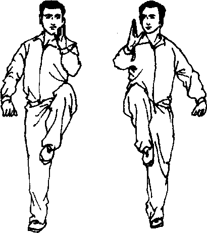 身体自然站立,重心移于右腿,独立支撑,左腿屈 膝上提于体前,大腿高于腰的水平线,小腿下垂内收, 脚面展平。左手成侧掌挑举于头前,指尖与眼平,右手 下按于体侧。上体斜向前方,眼看左手指(图65)。此 势练至体力稍感不支时,左腿下落,左脚踏实,身体重 心移于左腿,左腿独立支撑,右腿屈膝上提至体前(图 66)。如此左右两腿轮换练习。