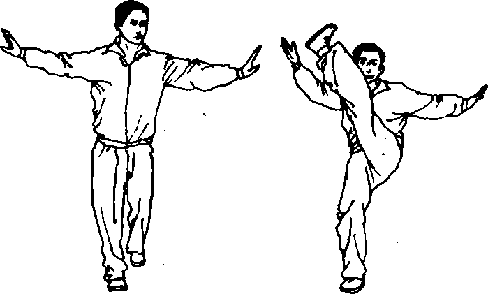 (2)摆腿时要顶头、立腰、挺胸、松毓、开合胯。