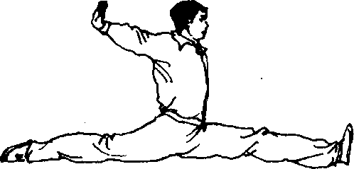 (1)竖叉:两腿前后分开成直线,前腿后侧着地, 脚尖勾起,后腿内侧或前侧着地。上体正直,胯部落于 地面。两手侧平举或左右扶地。目视前方(图90)。