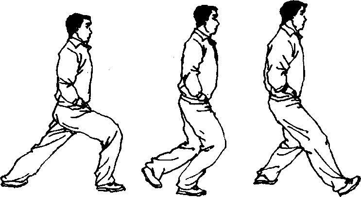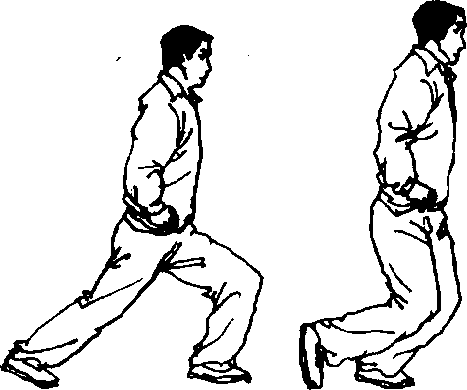 (1)屈膝蹲坐,左脚向前上步,重心前移,左腿屈 弓,成左弓步(图124)。