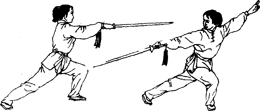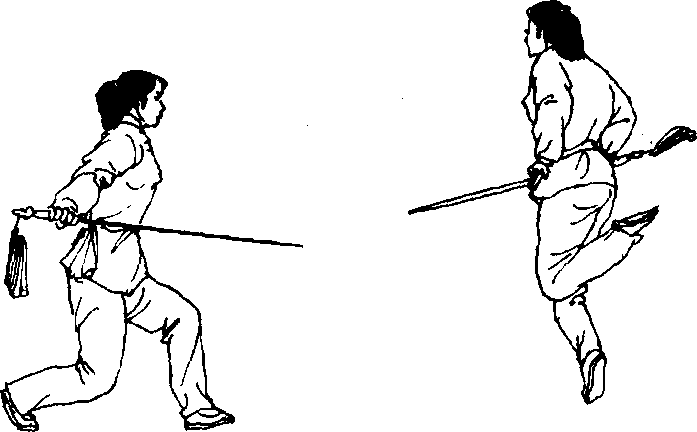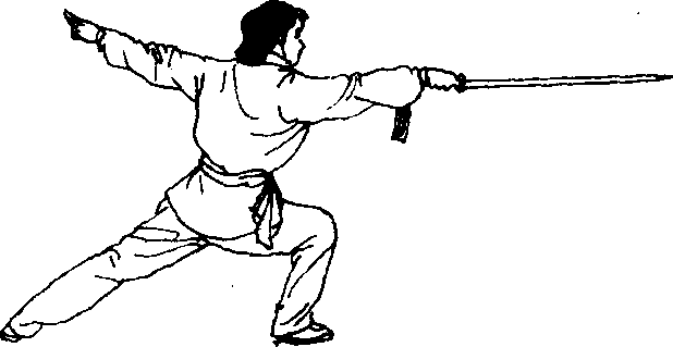 ⑤以左脚掌为轴,上体右后转,右脚随之提起向 前迈出,右腿屈膝前弓,成右弓步;右手持剑经腰间向 前立剑刺出,左剑指向后伸直,两手虎口’皆向上,两臂 与剑成一直线;眼看剑尖(图146)。
