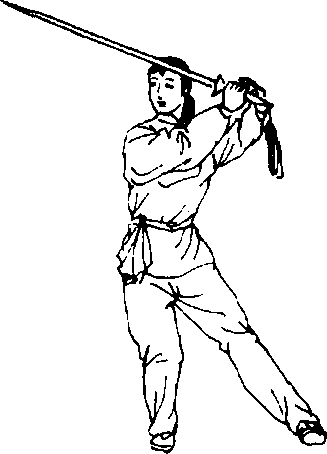 ②右手握剑下落?劈至体前,虎口向上,高与肩 平,右臂与剑成一条电线。左剑指屈收,附于右臂内 侧;目视前方(图151)。