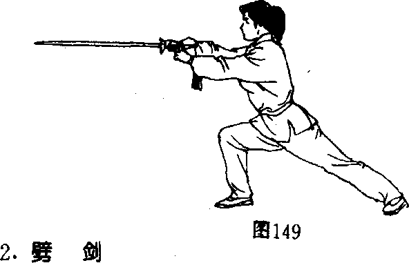 ⑧两腿依次落地成右弓步;剑随转身向前直刺, 高与肩平,虎口向上。剑指附于右腕;眼看前方(图 149)。