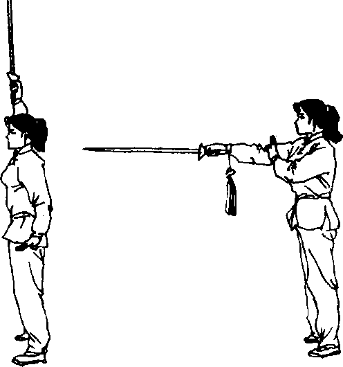 ①两脚并步站立;右手握剑直臂上举,剑尖向上, 剑指按于体侧;目视前方(图150)。