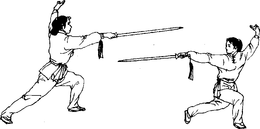 点剑须伸臂提腕,腕关节向下屈压,以剑下刃前 端向下点啄,力达剑端。