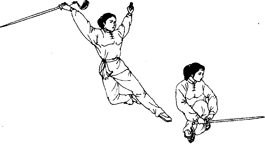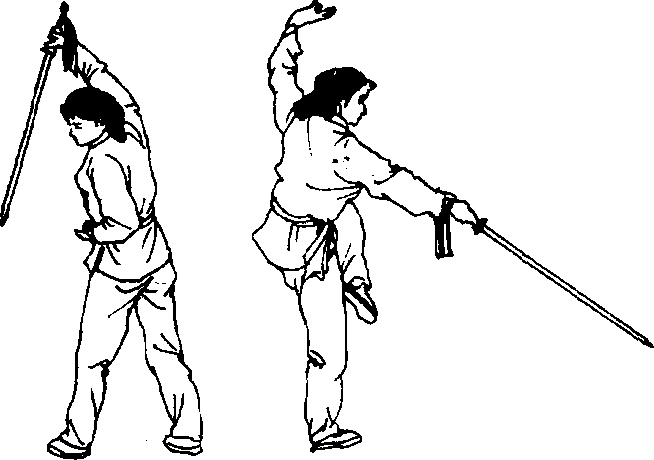 ⑦上体右后转约180。,右腿独立支撑,左腿屈膝 上提,成右独立步;右手持剑劈至前下方,臂与剑成一 条斜线,与地面约成45。。左剑指划弧举至头侧上方, 手心向上,左臂微屈;眼看前下方(图157)。
