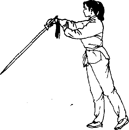 ①右手持剑;两脚前后错步站立,右脚在前。