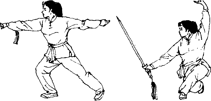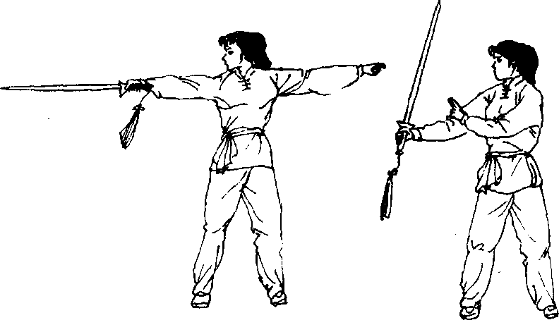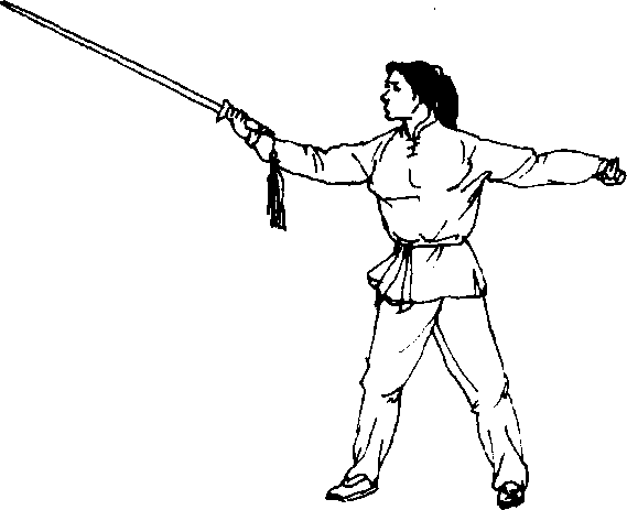 ①两脚开步站立,右手握剑侧平举,虎口向上,左 剑指也侧平举,两臂与剑成一直线;目视剑尖(图 167)O -