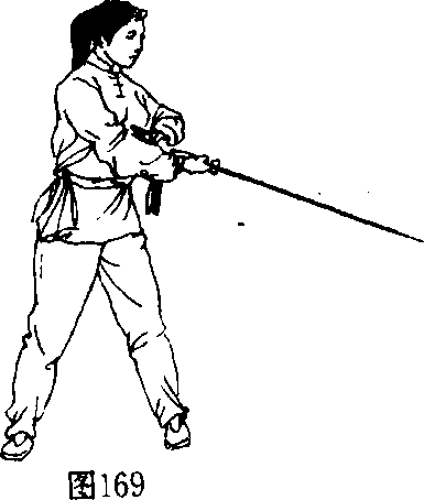 ④上体右转;右手持剑向右上方抖击,手心向上, 剑尖略高于头。左剑指伸向左下方,两臂与剑成一斜 线;目视剑尖(图170)。