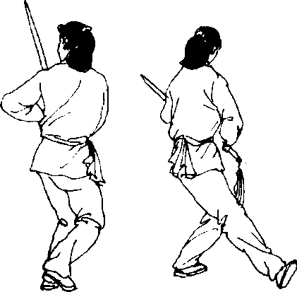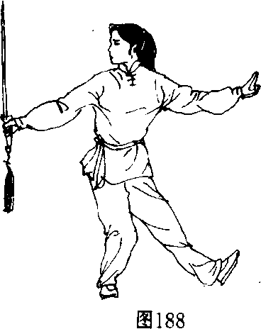 ⑤右脚向前上步,脚跟落地,脚尖外撇;右手持剑 向下绕转(图186)。