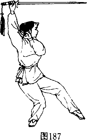 ⑥左脚向前上步,脚前掌着地,成左虚步;上体右 转;右手持剑内旋,直臂向前、向上撩出;剑举于头上, 虎口、剑尖皆向前。剑指附于右肩前;眼看前方(图 187)。