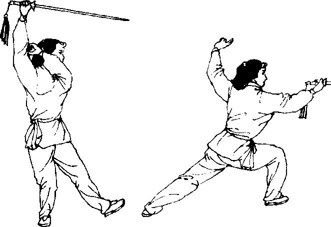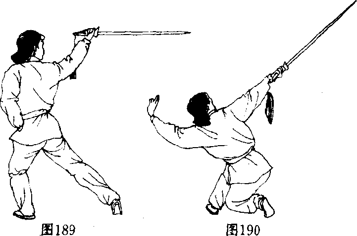 向右上方反手撩出,右臂内旋,与剑成一直线,斜向身 体右上方。左剑指划弧,举于头侧上方;头转看右剑 (图 190)。
