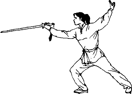⑩两脚蹬地,上体左转,右腿屈膝前弓,右手持剑 外旋,向下、向前划弧撩至体前。左剑指举于身体后上 方;眼看右手剑(图191)0