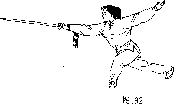 ?右腿后退一步,两腿交叉,左腿横脚屈弓,右腿 伸直,脚跟离地,成左叉步;右手持剑内旋,向上、向后 绕转一周后,向前反手撩出,剑与右臂成一直线,高与 肩平。左臂向后伸直,剑指背于身后;上体前倾,眼看 剑尖(图192)0