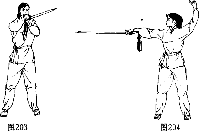 ①两脚平行,开步站立;右手握剑直臂前平举,高 与颈平,虎口向上。左剑指附于右臂内侧;目视前方 (图 203)。