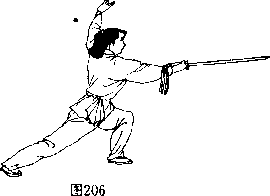 ④上体左转;重心左移,左腿屈膝前弓,右腿自然 蹬直,成左弓步;右手持剑随转体挥摆前扫,右臂伸直 扫至体前,手心向上,高与腰平。左剑指划弧举于头侧 上方;眼向前看(图206)。