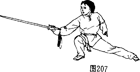 ③右腿屈蹲,左脚侧移,左腿向左伸宜;右手持剑 外旋,伸于右前方,手心向上,剑与地面平行,高与腰 平,剑指经左肋顺左腿向外反穿,手心向上;眼看右手 剑(图205)。