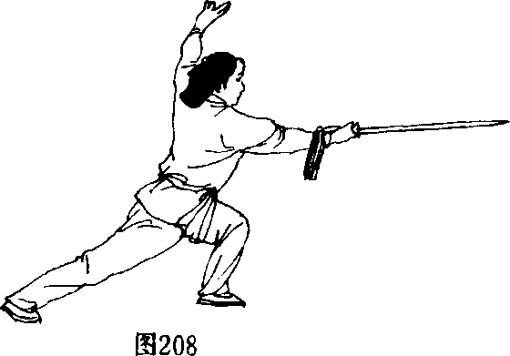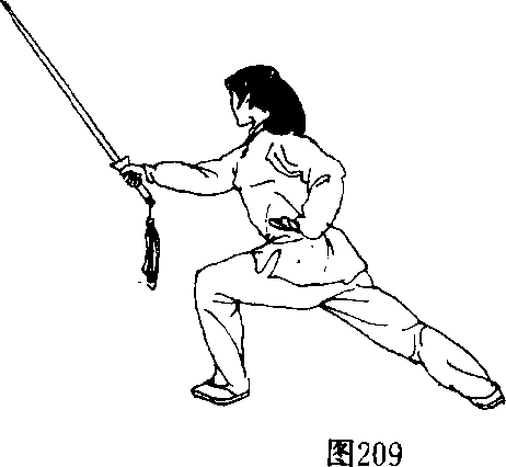 ④上体左转,左脚尖外撇,右脚前上一步,脚尖内 扣,右腿伸直;右手持剑向上、向左划弧至侧后方,虎 口及剑尖皆斜向上。剑指落收于腰间,手心向上;头看 右手剑(图209) o