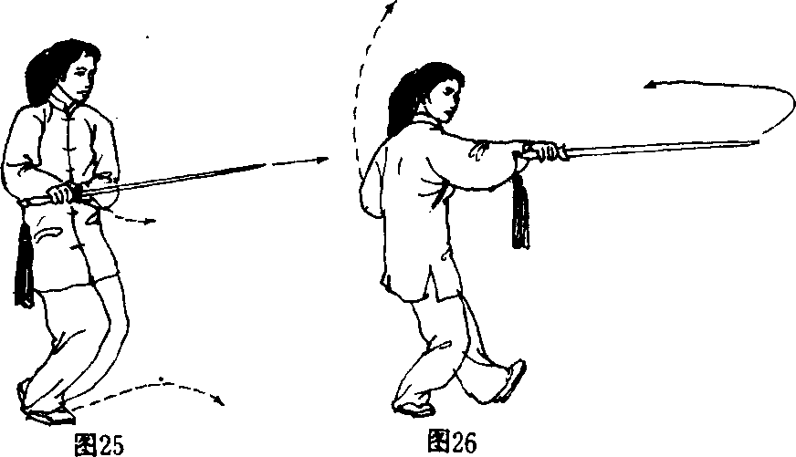 右手持剑屈臂后收;同时左脚提起收至右脚内侧 (脚尖不点地),眼看剑尖(图25)。