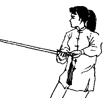 (1)两手向左右分开后,剑尖仍位于体前中线附 近,剑尖略高。