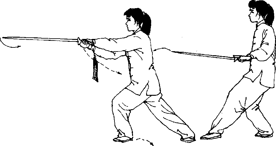 重心移向左腿,右脚随之收到左脚内侧,脚尖点 地成丁步;同时右手翻掌手心向上,并将剑向左平带 (剑尖略高),力在剑刃;左剑指向上、向前绕行划弧落 于右腕部;眼看剑尖(图48)。