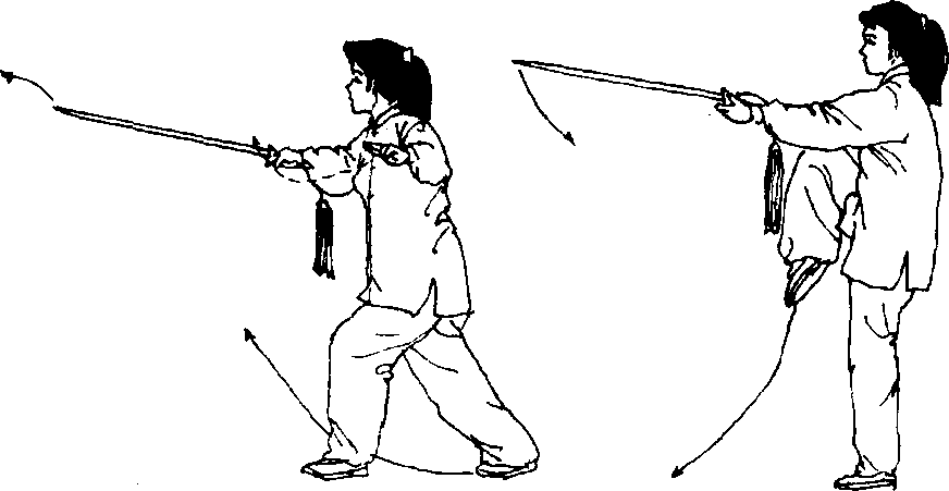 收脚带剑时,身体向左转,重心落于左腿;要保持 上体正直,松腰松胯,臀部不外凸。