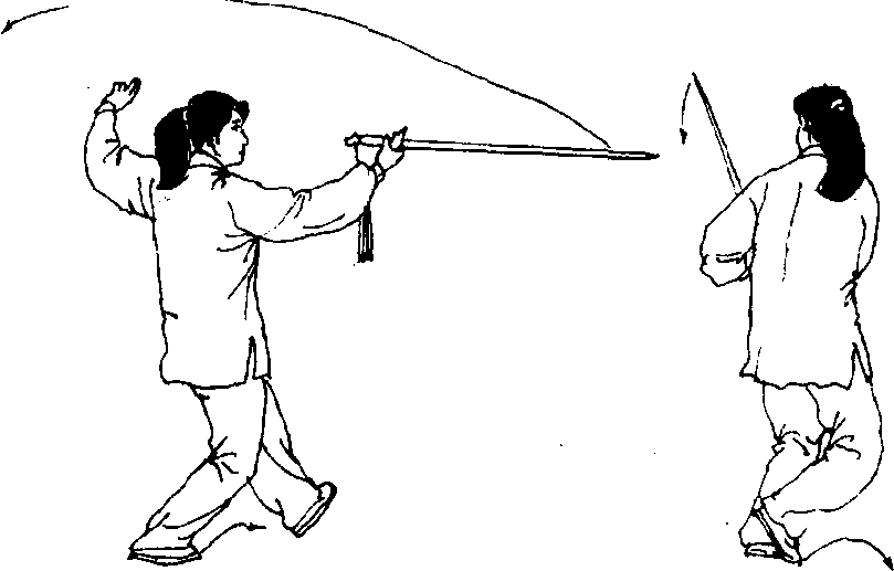 (3)右剑划圆绕转要贴近身体左侧。