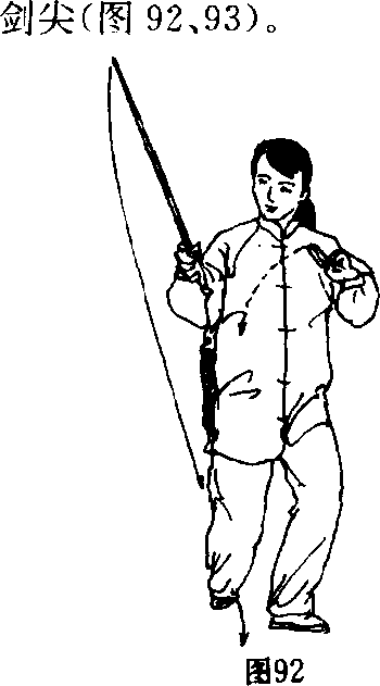 (2)点剑时要活握剑把,腕部上提。本势点剑时右 臂先向下沉,再伸臂提腕,高与肩平;点剑与右脚落地 要协调一致,上体保持正直。