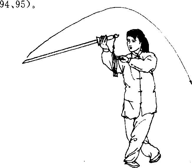 (3)剑的绕环、绕行、托举是一个完整连贯的动 作,练习进行中,不可有割裂、分解的痕迹,要一气呵 成。