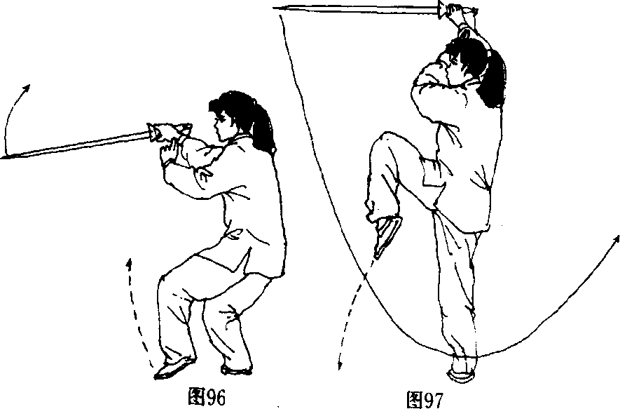 ,以两脚掌为轴碾地,使身体转向正西,随之左膝 提起成右独立步;同时右手持剑绕经体前向上托架, 剑身平,稍高于头,左剑指附于右臂内侧;眼看前方 (图 96、97)。