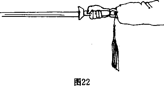 立剑,自上而下用力,力点在剑身下刃,臂与剑成 一直线。抡劈剑是将剑抡一个立圆,然后向前下劈(图 22)。