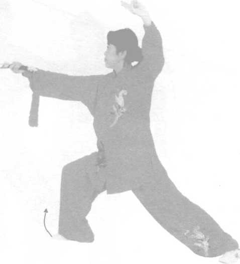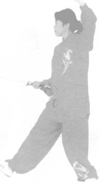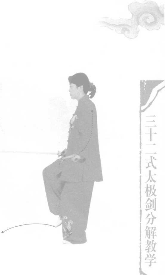 上步时右脚轻落,重心仍在左腿。右手卷剑,左剑指划弧上举时,注意